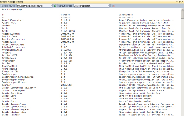 Por exemplo, para listar todos os pacotes disponíveis usando o Package Manager Console, digite o comando “list-package”. Veja o resultado na figura: